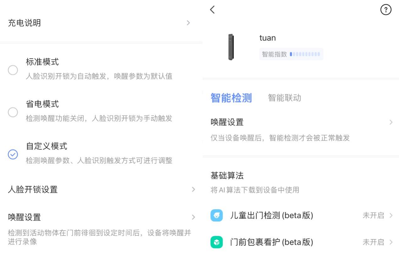 △萤石Y3000FVX双摄版带有三种电源模式调节功能,同时AI算法商店还能基于图像算法实现门前包裹看护、儿童出门检测等提醒功能,后续如果还有新算法提供下载,还能持续拓展门锁新功能