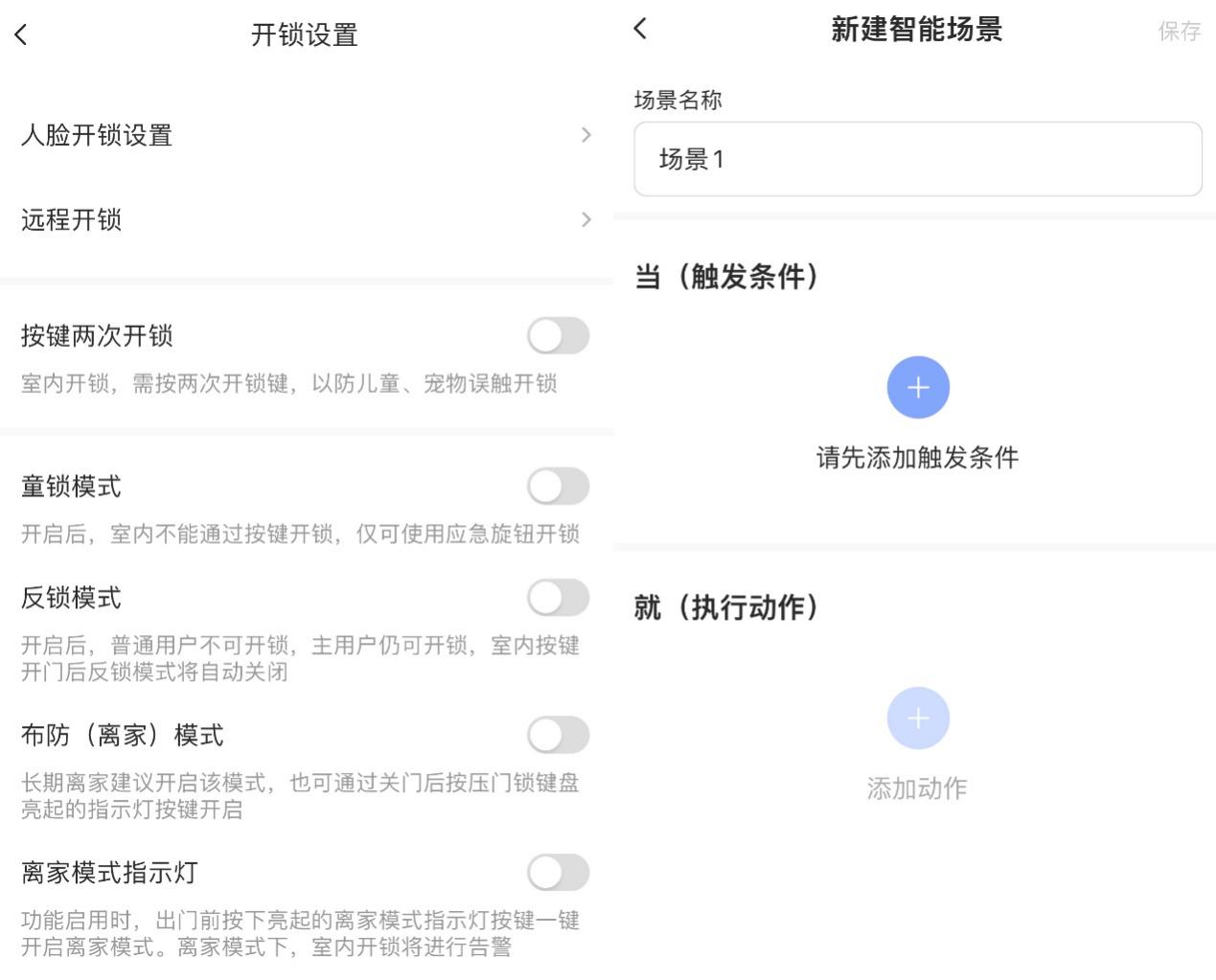 △萤石Y3000FVX双摄版提供有丰富的开锁功能设置选项,比如电子解锁按键可以设置成防儿童和宠物的2次按键开锁模式,另外通过APP还可以设置反锁模式、布防模式等,并支持智能家居联动设置