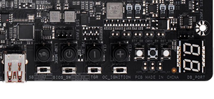 易用性方面,Z790钛雕当然是针对超频玩家进行了专门设计的。主板上内存插槽附近有一片区域就放置了大量的超频功能按键与开关,包括保护模式、电源、倍频(加减)、冷重启、清除CMOS数据、重启几大功能按键与BIOS模式、BIOS切换、超频切换、超频点火(不启动预测试水冷、无CPU更新固件)等开关,同时还提供了电压检测点,极限超频玩家都懂的,这就叫专业。