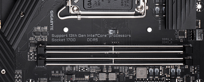 除了支持处理器极限超频,Z790钛雕在内存超频方面也有做到顶级的独到之处。首先,在布线方面,Z790钛雕不但采用了菊链式走线的双插槽配置来降低信号干扰,还尽量缩短了内存插槽与处理器插座之间的举例来减小信号延迟与损耗,而在低阻抗PCB中也设计了内存抗干扰遮罩并优化了布线宽度、长度与样式,目的就是为了实现更高的内存频率。此外,技嘉还专门为Z790钛雕配备了DDR5内存电压解锁功能,可以将DDR5的PMIC解锁为可编程模式,从而实现对DDR5电压更宽范围的调节,方便发烧玩家冲击内存超频极限。
