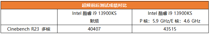 使用一体式水冷散热器对酷睿i9 13900KS进行全核超频无疑就是在撞温度墙和满血释放之间找平衡。最后我们在降低0.15V核心电压的情况下,将P核提升到了全核5.9GHz,E核提升到了4.6GHz并稳定通过了Cinebench R23的考机测试。从Cinebench R23的多核得分来看,提升幅度大约为7.7%,这对于一体式水冷散热器来讲已经不错了。当然,这远远没达到Z790钛雕的极限,如果玩家手里有更强悍的散热方案,不妨尝试一下更高的频率。