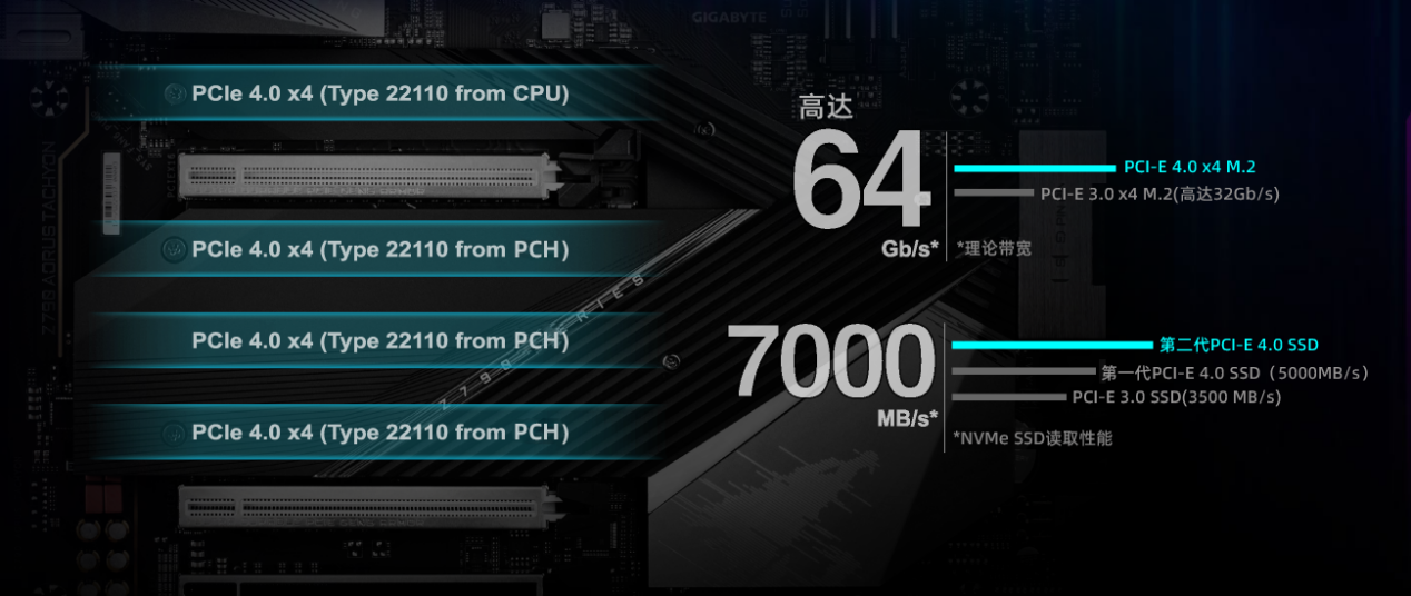 存储扩展部分,虽说Z790钛雕专注于极致超频,但它同样考虑到了发烧玩家也会用它搭建旗舰主机使用的可能,因此提供了多达4条M.2插槽,全部都支持PCIe 4.0×4 Type 22110规格,对于高端用户来说也是完全够用的。