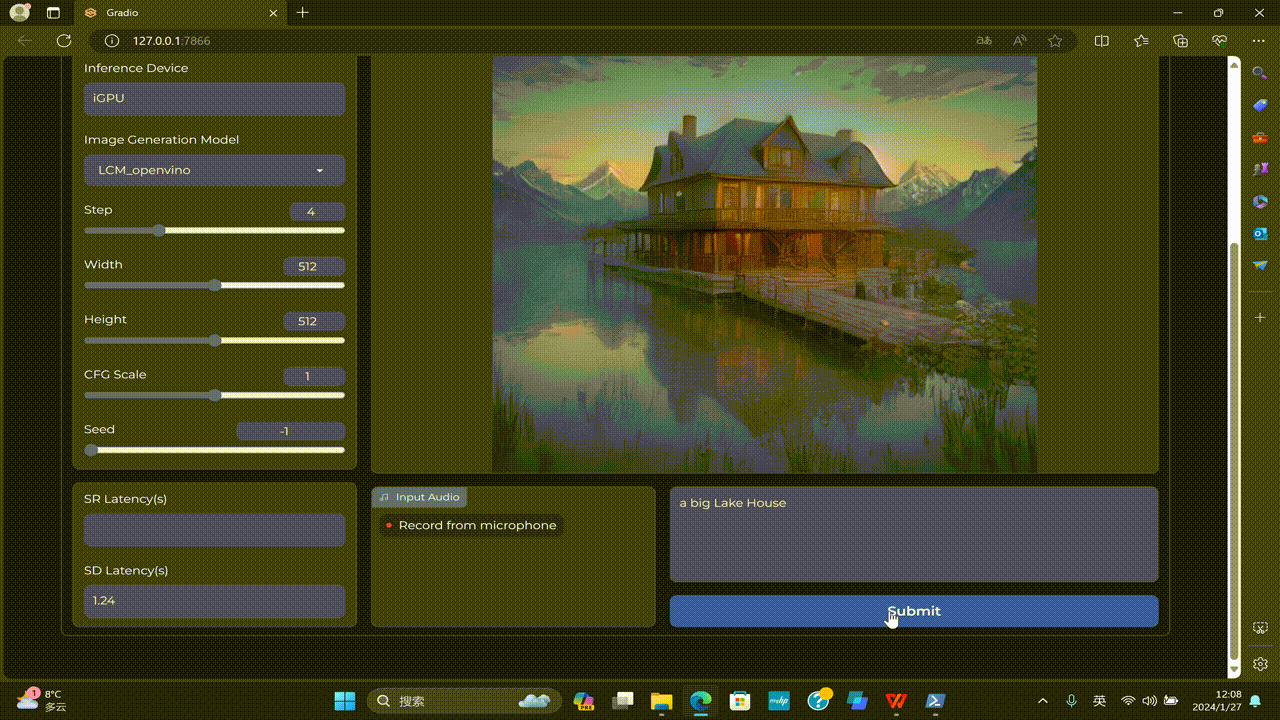 ●Stable Diffusion LCM_openvino本地AI文字生图。Stable Diffusion是当下非常流行的AI创作工具,而LCM(潜在一致性模型)能极大地加速图像的生成,计算复杂度和内存需求也更低。实测来看,我们利用星Book Pro 14生成一张湖边小屋的图,只需要1秒多就完成!速度的确惊人。尽管目前图像在质量方面还不够特别理想,但AI进步的速度也相当快,未来的发展是值得期待的。