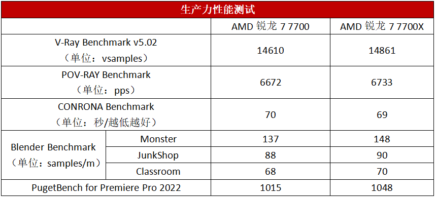 从测试结果可以看到,锐龙7 7700基本上保有了锐龙7 7700X大约97%的性能,不管是3D渲染输出还是视频剪辑,效率都是有保障的。