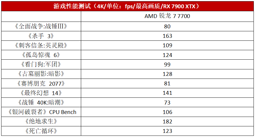 在大家关注的游戏性能方面,可以看到有IPC性能不俗的Zen4架构、5.3GHz最高频率以及32MB三级缓存加持的锐龙7 7700就算是搭配RX 7900 XTX这样的旗舰显卡,也有较高的性能足以保证不会拖显卡的后腿,在最高画质下,它可以让绝大多数主流3A游戏大作都保持在100 fps水平的高帧率下,不管是应对单机游戏还是多人网游都足以满足对CPU的需求。
