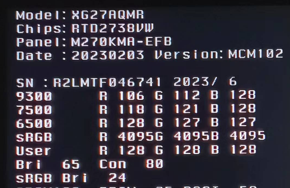 一款出色的电竞显示器,除了要具备良好的游戏体验外,还需要有出色的显示性能。ROG STRIX XG27AQMR电竞显示器搭载了一块2K分辨率(2560×1440)27英寸FastIPS面板,从显示器的工厂模式可以看到,该显示器搭载了群创M270KMA-EFB面板,该面板为原生8Bit,采用FCR方式实现10Bit色深。