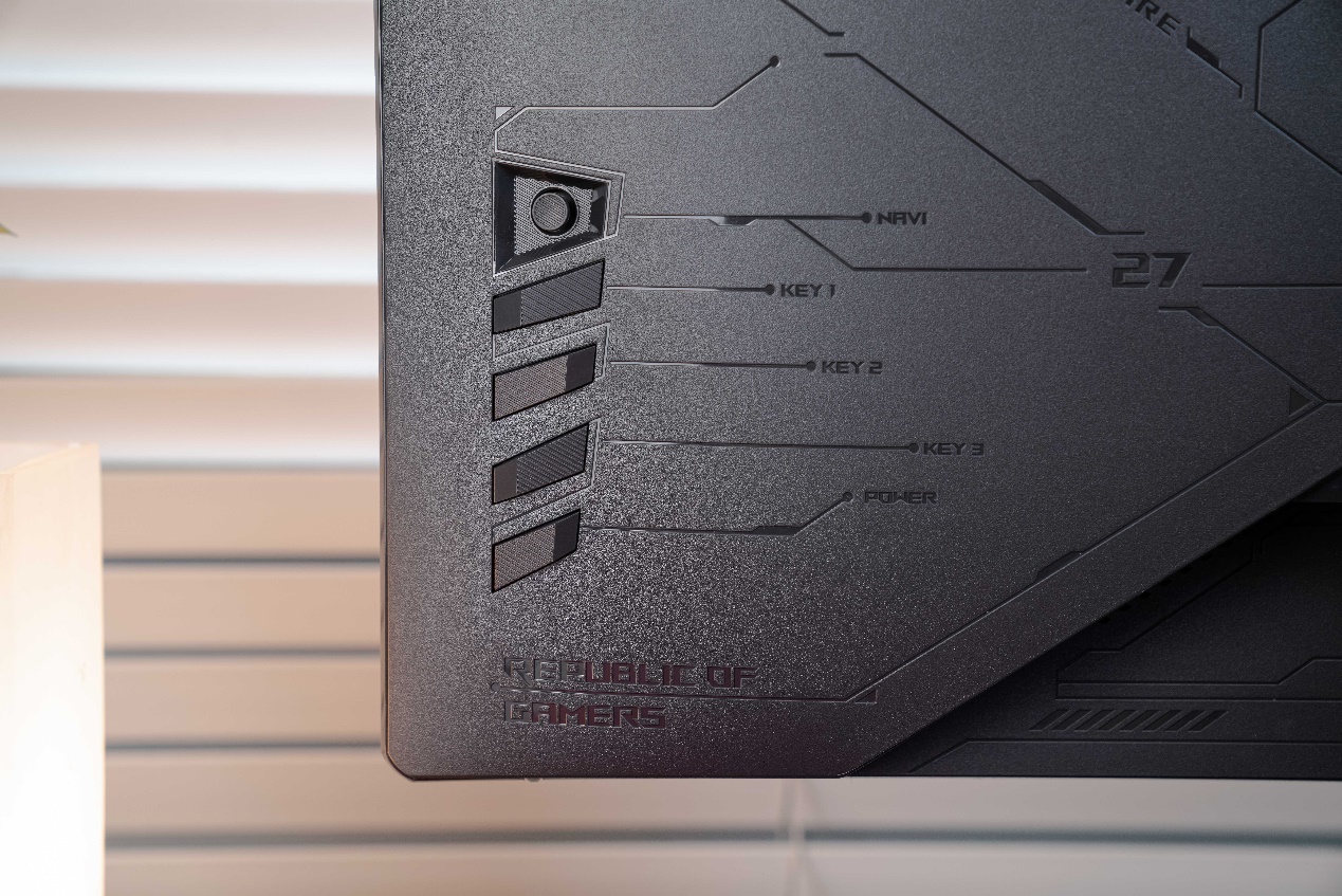 显示器背面同样传承了ROG的“信仰”风格,右侧巨大的“败家之眼”Logo足以体现其血统。与之前产品不同的是,背面右侧的信仰图腾纹理现在由左侧新的被叫走“游戏灵感图案”的纹理所取代,显得更加时尚。操控方面则依旧是OSD操控摇杆和四个独立按键,虽然按键在背面,但每个按键形状不同,方便盲操。设置时只需控制摇杆就能非常轻松地在显示器菜单中调整各类参数。