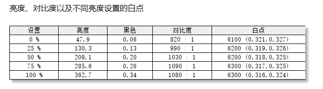 白点设置方面,在显示器设置为6400K的情况下,从0%~100%分5挡测试白点,测得白点值为6100~6300,整体来看比较接近6400,表现还是比较不错的。