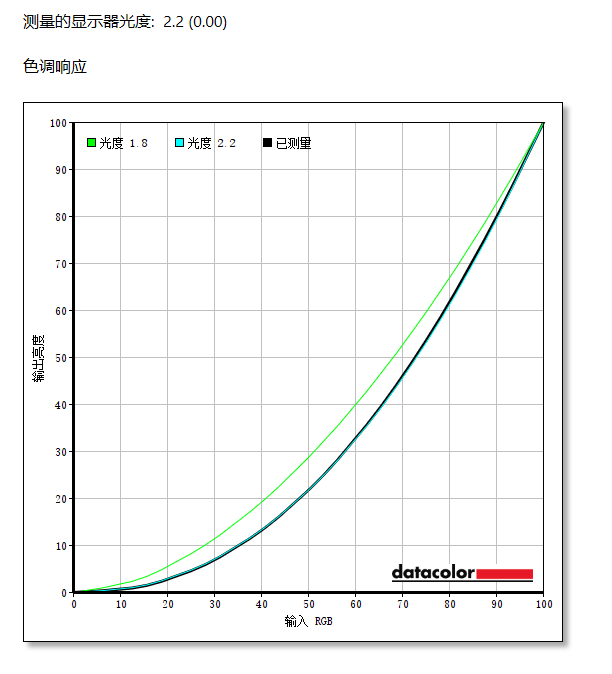 色调响应方面,测得该显示器的色调响应曲线非常契合Gamma2.2的曲线,表现比较不错。
