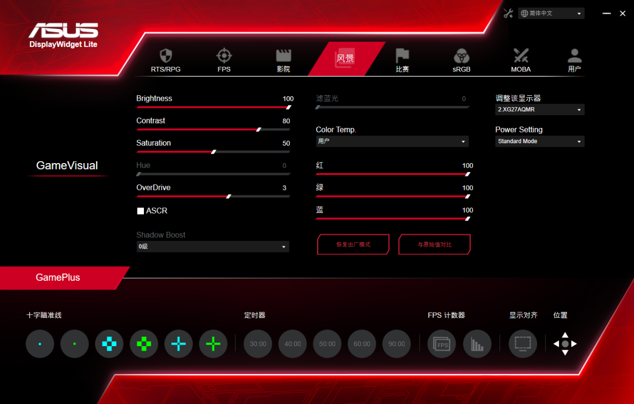 另外,ROG STRIX XG27AQMR还支持ASUS DisplayWidgetLite桌面实用程序,玩家可以在电脑上通过该软件直接对显示器的模式、亮度、对比和GamePlus等设置进行调节,比手动按显示器的OSD按钮更加方便快捷。