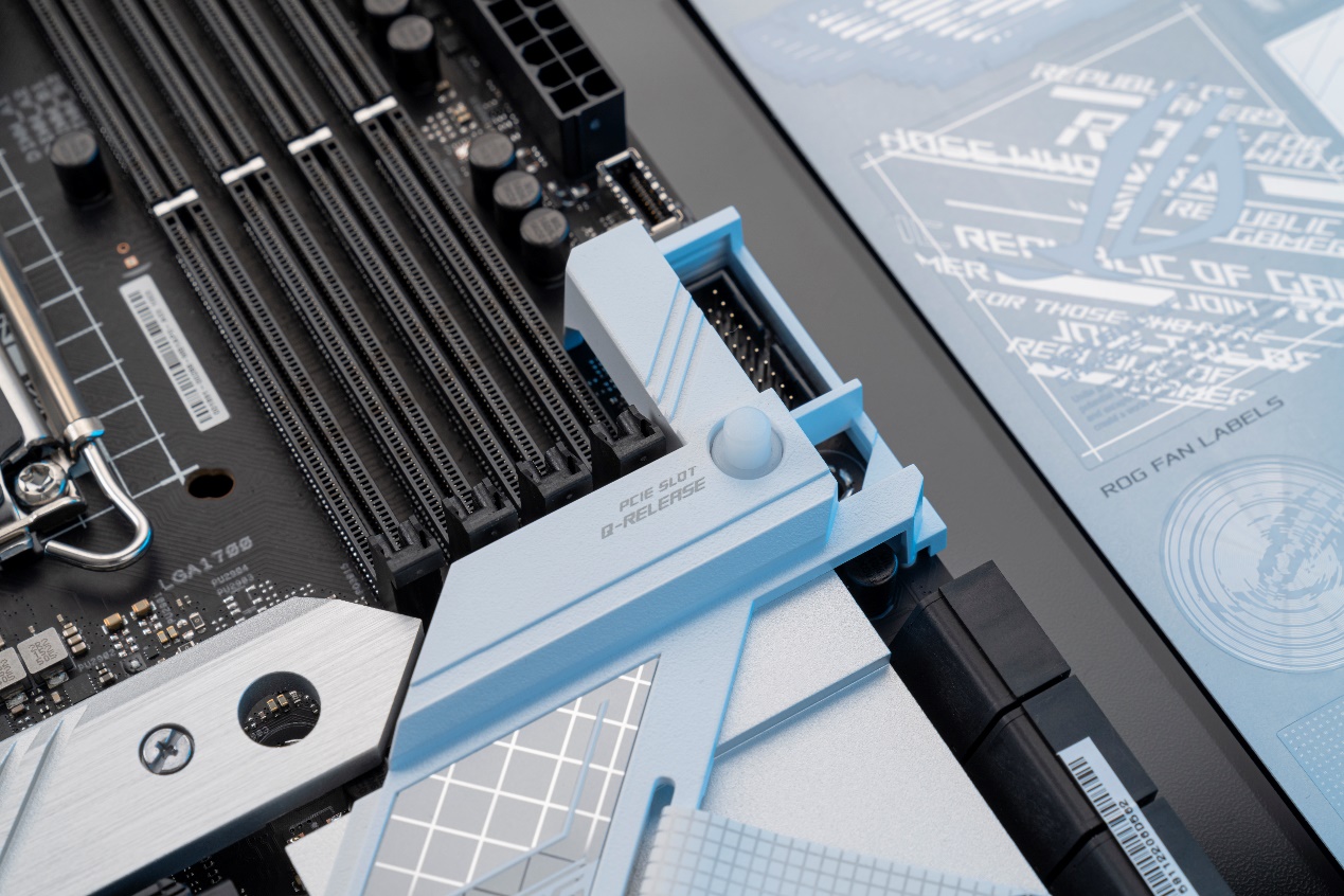 主插槽采用了高强度安全插槽技术,拥有更高强度以应对旗舰显卡。同时,该插槽旁还设计有一个ROG显卡易拆键,玩家只需要按下按钮,就可以轻松解锁显卡的PCIe插槽,让用户不在因为显卡拆卸麻烦而苦恼。这个显卡易拆键采用POM塑料打造,拥有高强度、高刚性和高韧性。