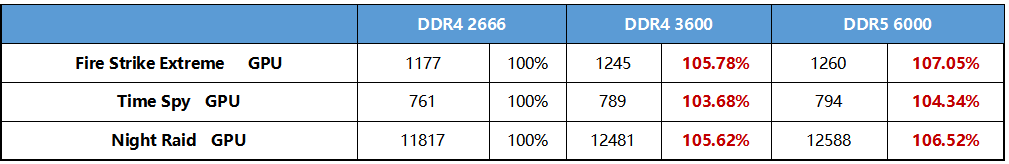 从基准测试的成绩来看,得益于内存频率带来的UHD 770核显显存带宽的提升,核显的跑分成绩提升相对明显。特别是从DDR4 2666提升到3600时,核显跑分提升最为明显,在Fire Strike Extreme 测试中GPU分数最多提升了5.78%。不过,将内存从DDR4 3600升级到DDR5 6000的提升幅度却没有2666到3600那么大了,我们推测应该是内存频率过高之后,UHD 770的性能已经成为了瓶颈。不过,需要注意的是,3D Mark GPU基准测试只能反映出显存对GPU性能的影响,而内存频率地提升本身对游戏也是有增益的,所以游戏实战的效果可能会不一样,大家可以接着看我们实战的部分。