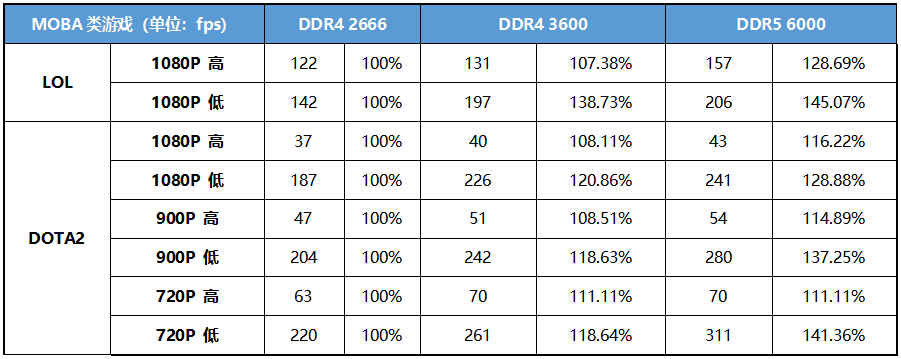 主流MOBA类游戏的引擎有个共同的特点,除开显卡与显存对游戏帧率有影响之外,内存频率和带宽本身也对游戏帧率有较大影响,因此实测的情况与3D Mark基准测试有所不同。从测试数据来看,LOL在1080P高画质下,使用DDR4 3600相比2666帧率仅提升了约7%,但升级到DDR5 6000却提升了28%以上,这就印证了我们的预判。而把画质降到低,2666升级到3600就提升了38%以上,升级到DDR5 6000则提升了约45%,可见减小GPU的压力就等于减小了GPU带来的瓶颈效应,内存带宽的提升带来的增益变得更加明显了。DOTA2的测试部分,我们进一步细化了测试项目,除了1080P分辨率外还增加了900P和720P。果不其然,随着画质的降低,UHD 770的负载压力变小,内存升级的效果也变得更加明显了。当然,一般来讲现在也没有人喜欢在低于1080P以下的分辨率玩游戏,因此综合这里的测试数据来看,使用DDR4 3600是升级效果与升级成本最为划算的方案,DDR5 6000在低分辨率低画质下确实可以带来夸张的帧率提升,但在1080P下的提升幅度就没有那么明显了。