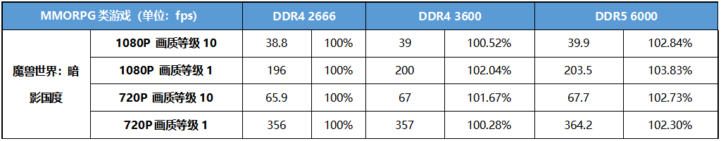 《魔兽世界:暗影国度》的引擎比较传统,它对于GPU本身的性能更加敏感,因此我们可以看到,使用UHD 770核显时,升级内存频率带来的游戏帧率提升幅度很小,几乎都可以算在误差范围内了。所以,如果你用UHD 700系列核显玩《魔兽世界:暗影国度》,可以不怎么在意内存频率的高低。