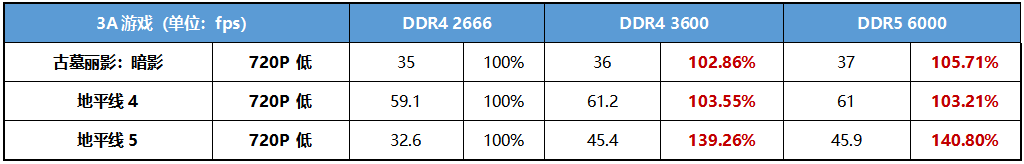 用UHD 770来玩3A游戏着实有些太过了,但要是把分辨率降低到720P,也并不是不能玩。当然,测试结果和前面的《魔兽世界:暗影国度》是比较类似的,毕竟3A游戏对于GPU的性能要求更高,即便是720P低画质,UHD 770也有些不堪重负,此时内存频率带来的提升也就很小了。不过,我们也遇到了一个很特殊的情况,那就是《地平线5》,从DDR4 2666升级到3600居然带来了39%以上的帧率提升,当然这也基本上就是极限了,之后再从DDR4 3600升级到DDR5 6000提升幅度还不到1%。