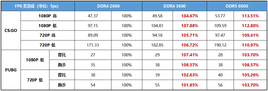 《CS:GO》和《PUBG》这样的FPS游戏相对MOBA类游戏来讲,对核显的压力更高,因此瓶颈效应也会变得更加明显,所以不管是提升内存频率还是随之提升的显存频率,带来的帧率提升都不会像MOBA游戏那么夸张。大家从数据可以看到,两款游戏从DDR4 2666升级3600带来的帧率提升都在10%以内,DDR5 6000或许会带来进一步的少量帧率提升,但在一些设置下甚至表现还不如DDR4 3600(这个帧率差异基本上就是测试误差),可见此时UHD 770已经是性能瓶颈了,搭配DDR4 3600已然够用,再升级内存频率意义已经不大。