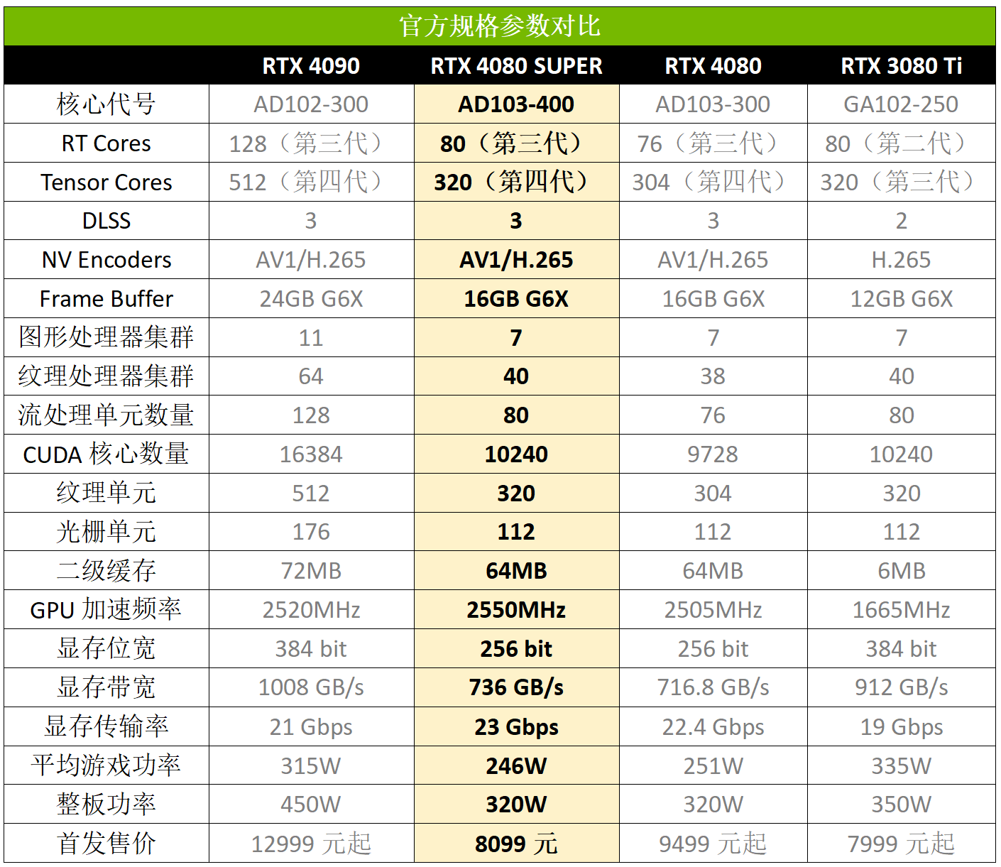 至于首发价格,RTX 4080 SUPER只有8099元,比RTX 4080便宜了1400元,提升了其性价比。对于高端用户来说,RTX 4080 SUPER给他们提供了一个更高性能且更优价格的选择,无疑是当前高端显卡的性价比之选。