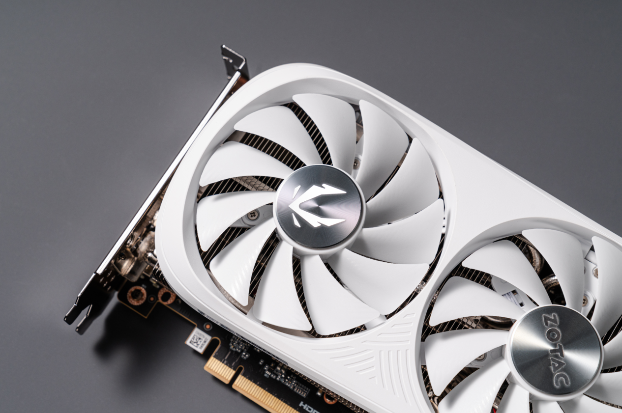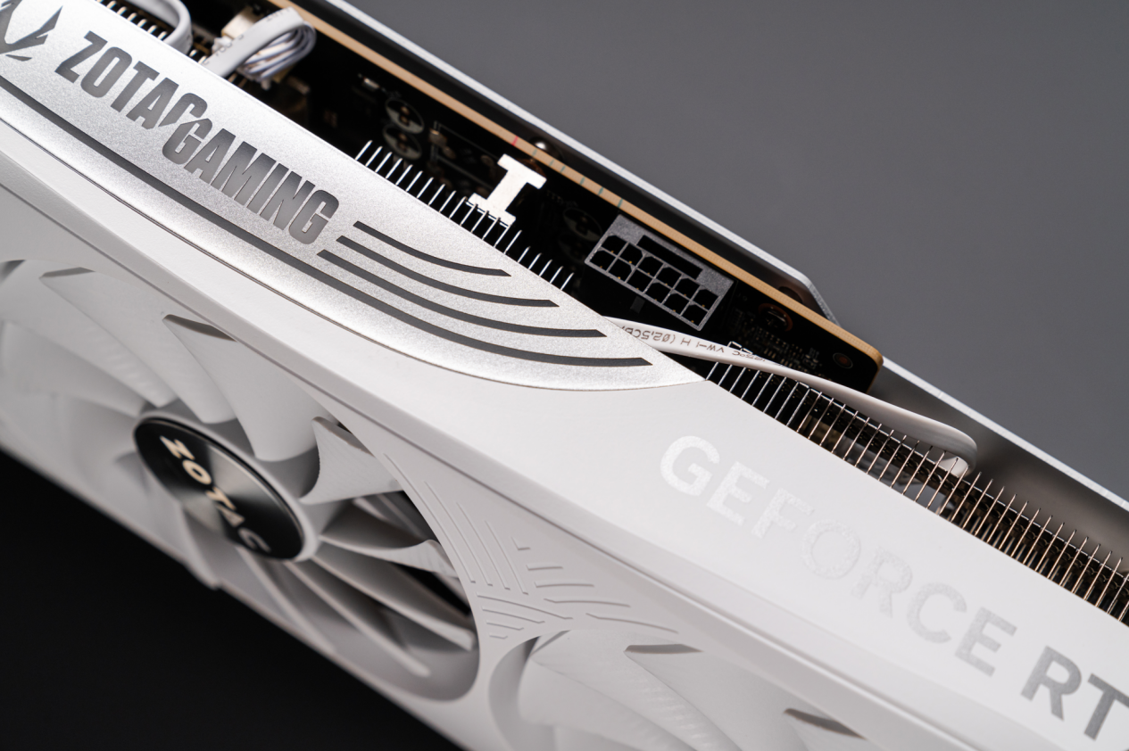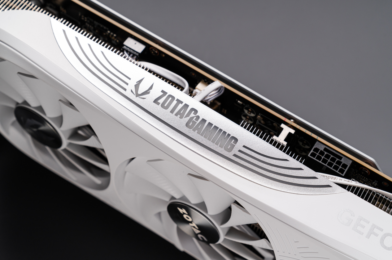 在灯光效果的打造上,索泰RTX 4080 SUPER 16GB TRINITY OC月白的表现也可圈可点。特别值得一提的是,在玩家最为关注显卡的侧面,显卡引入了名为“虹桥幻影”的创意灯效。如其名所示,通过ARGB灯带的巧妙布局,营造出一座仿佛彩虹般的拱桥造型,极大地提升了侧面的视觉冲击力与炫酷感。此外,显卡侧面还醒目地印有硕大的ZOTAC GAMING字样和LOGO,这不仅是对品牌信仰的彰显,更为显卡增添了一份独特的身份标识。