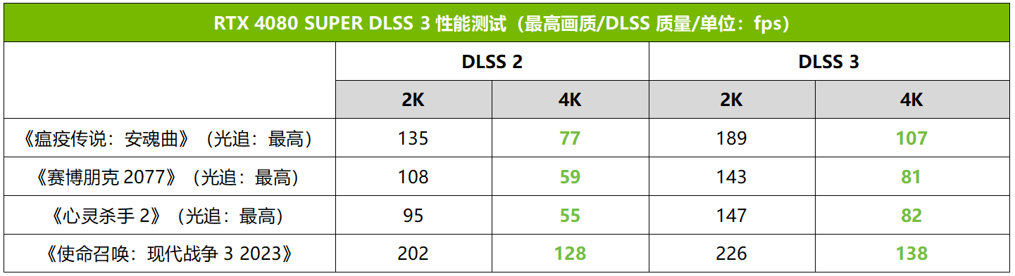 在开启DLSS 3之后,多款游戏的4K分辨率性能得到了大幅提升,原本在DLSS 2质量挡下不流畅的游戏,也将帧率提升到了80fps以上,实现了流畅的游戏画面。比如《瘟疫传说:安魂曲》的画面帧率从77fps提升到了107fps,提升幅度在38%以上;《赛博朋克2077》也从59fps提升到了81fps,提升幅度在37%;而《心灵杀手2》的画面平均帧率更是从55fps来到了82fps,实现了将近50%的性能提升,性能提升了不止一个档次。