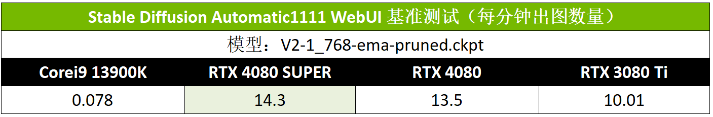 Stable Diffusion是当下最火的本地AI出图工具,NVIDIA GPU则是运行它最高效、兼容性最好的装备。Stable Diffusion的基准测试部分,我们使用了NVIDIA官方推荐的标准设置方便与之前的测试数据对比。采样方式为Euler a、采样步数为50、CFG Scale为7.5、每批次出图数为2、批次为10,最后统计每分钟出图数量。可以看到,索泰RTX 4080 SUPER 16GB TRINITY OC月白的出图速度大约比RTX 4080快了5%。