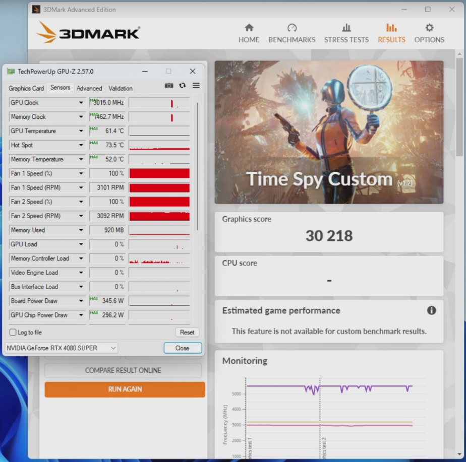 我们还尝试对索泰RTX 4080 SUPER 16GB TRINITY OC月白进行了超频,其游戏最高频率达到了3015MHz,TimeSpy的跑分成绩也所有提升,达到了30218分,性能表现更加出色。