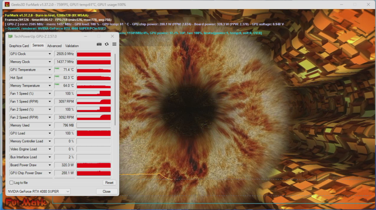 索泰RTX 4080 SUPER 16GB TRINITY OC月白在满载考机时的最高频率也能达到2505MHz,此时显卡的整板功率达到了320W,GPU最高功率达到了288W,与官方规格参数完美匹配。在此状态下,凭借着性能强悍的散热器,索泰RTX 4080 SUPER 16GB TRINITY OC月白的GPU最高温度稳定在了71.4℃,热点温度为82.3℃,对于这样一款高性能的旗舰显卡来说,这样的表现算是相当不错的了。
