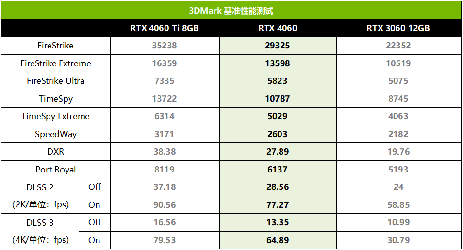 基准性能部分,代表DX11性能的FireStrike测试中,技嘉RTX 4060魔鹰相对RTX 3060大约有15%~31%的优势。代表DX12性能的TimeSpy和TimeSpy Extreme测试中,技嘉RTX 4060魔鹰相对RTX 3060大约有23%的优势。DX12U的SpeedWay测试中,技嘉RTX 4060魔鹰也领先了RTX 3060大约19%。光追测试项目部分,技嘉RTX 4060魔鹰在DXR测试中领先RTX 3060大约41%,PortPoyal中领先18%。DLSS测试部分,开启DLSS 2后技嘉RTX 4060魔鹰领先了RTX 3060大约31%,开启拥有帧生成功能的DLSS 3后更是领先了110%。