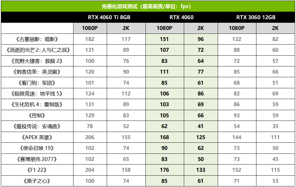 光栅化游戏实测部分,1080P下,技嘉RTX 4060魔鹰在《刺客信条:英灵殿》中最高领先了RTX 3060大约31%,全部游戏综合下来领先幅度大约为20%。2K分辨率下,技嘉RTX 4060魔鹰最多领先RTX 3060大约25%,平均下来领先幅度为17%。