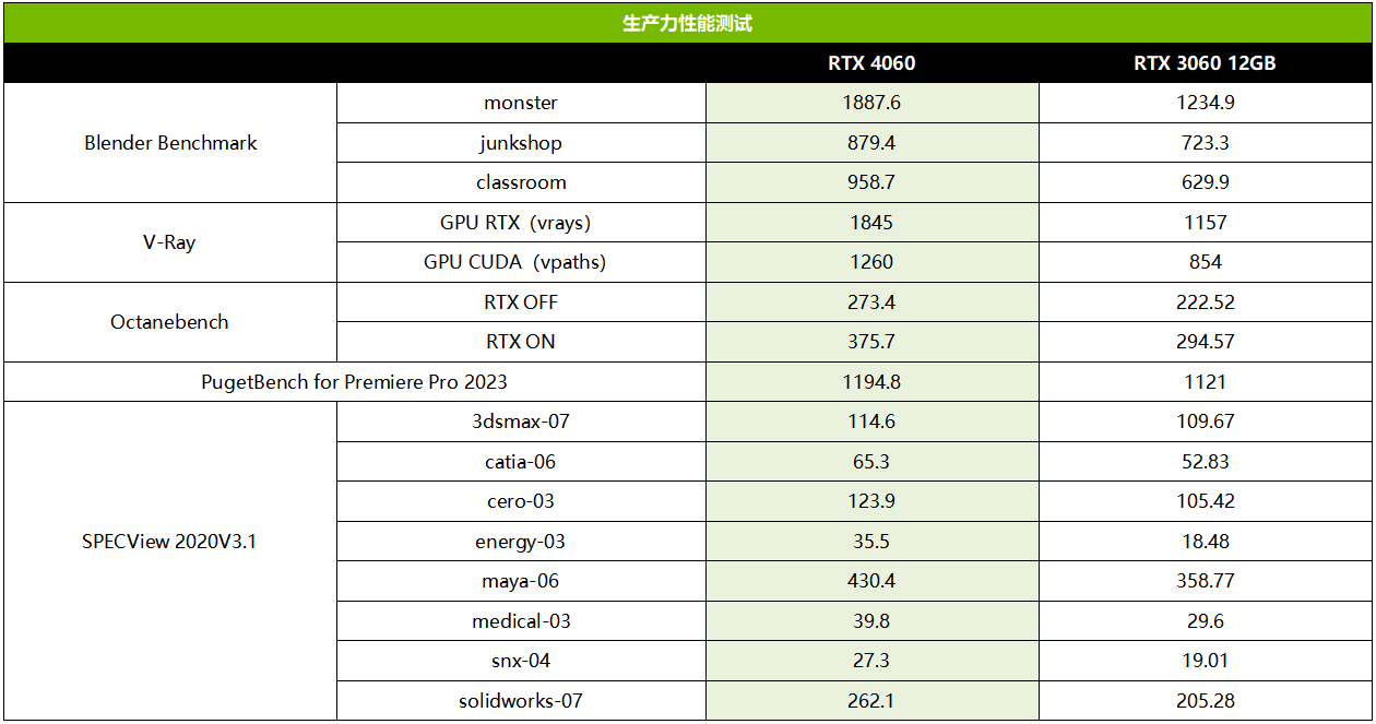 生产力性能方面,3D渲染方面,Blender Benchmark中技嘉RTX 4060魔鹰平均领先RTX 3060大约42%,V-Ray中平均领先53%;Octanebench中,关闭RTX领先23%,开启RTX领先28%;SPECView测试中,技嘉RTX 4060魔鹰综合领先RTX 3060的幅度也达到了33%。可以看到,相对光栅游戏性能提升幅度,RTX 4060在3D内容创作方面的生产力提升幅度甚至更为抢眼。
