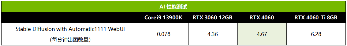 我们用Stable Diffusion对技嘉RTX 4060魔鹰的AI出图性能也进行了测试。实测技嘉RTX 4060魔鹰每分钟出图数量为4.67张,相对RTX 3060大约提升了7%,大约是酷睿i9 13900K的60倍。