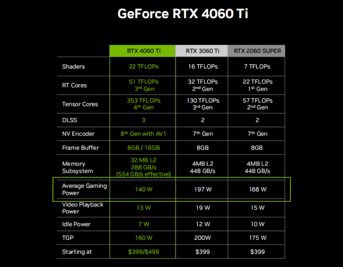 此外,能效比方面也是RTX 4060 Ti的一大亮点,它的平均游戏功率仅有140W,远低于RTX 3060 Ti的197W,因此对散热和供电的要求也更低。