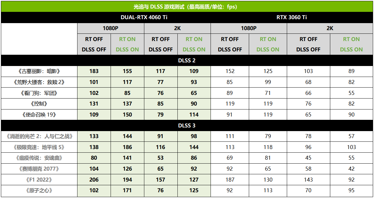 根据NVIDIA的数据,在32MB二级缓存的加持下,RTX 4060 Ti的实际等效显存带宽高达554 GB/s,是远远高于RTX 3060 Ti的,这在游戏中也能带来更好的表现,特别是在开启光线追踪和DLSS 3的情况下,能够带来更多的帧率提升。