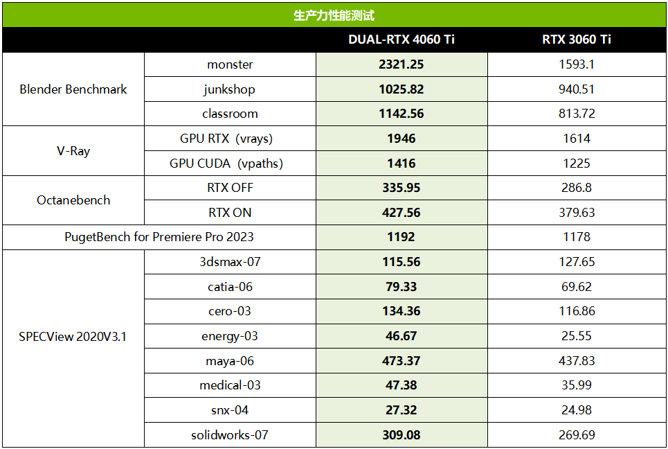 拥有第三代RT Core和第四代Tensor Core的RTX 4060 Ti也可以称得上是甜品级生产力工具。从测试结果来看,RTX 4060 Ti在3D渲染类应用中(SPECView的energy-03项目)最多可领先RTX 3060 Ti大约83%,综合所有的项目来看,平均领先RTX 3060 Ti大约20%。