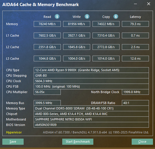 从处理器基准测试和生产力测试软件的成绩来看,锐龙9 9800X3D在蓝宝石 NiTRO+ 氮动B850A WIFI上可以释放出全部性能,与在X8700E上没有区别。毕竟主板拥有高规格的用料和散热配置,取得这样的成绩也完全在我们的意料当中。