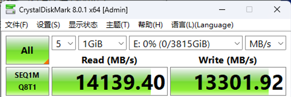 用《CrystalDiskMark》测试佰维X570 PRO 4TB的性能表现,可以看到产品顺序读写速度分别达到了14139MB/s和13301MB/s均达到了官方的宣称数值。表明蓝宝石 NiTRO+ 氮动B850A WIFI主板在PCIe 5.0 M.2 SSD插槽性能上的表现也无可挑剔。