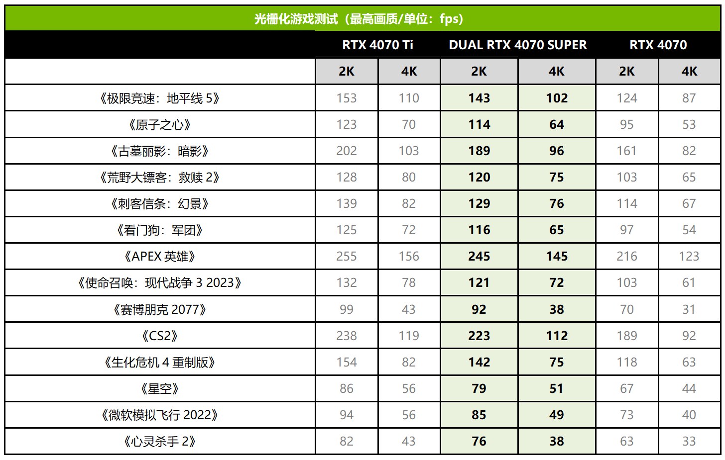 接下来我们进入实际的游戏测试,NVIDIA官方给RTX 4070 SUPER的定位是2K高帧游戏体验,不过我们也加入了4K下的成绩,方便大家参考。先来看看纯光栅游戏的表现,在2K分辨率下,RTX 4070 SUPER平均帧率相对RTX 3070 Ti提升了18%左右,部分游戏的领先幅度超过20%,可以达到RTX 4070 Ti 93%的性能。随着分辨率来到4K,RTX 4070依然相比RTX 4070保持了18%的领先优势,达到RTX 4070 Ti 91%的性能,与3DMark基准测试的情况比较符合。从帧率上看,在4K分辨率最高画质下,RTX 4070 SUPER也可以让大部分游戏大作保持平均60fps以上的流畅帧率.