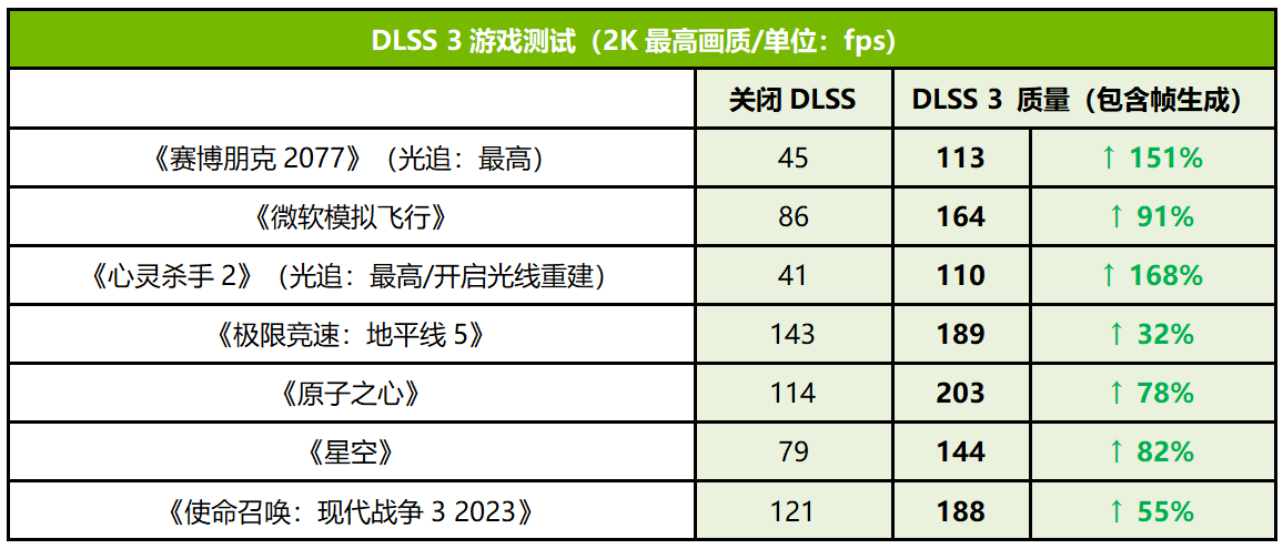 DLSS 3是RTX 40独占的“黑科技”,目前已经有很多游戏大作都添加了对DLSS 3的支持,而支持DLSS 3.5(新增光线重构)的游戏大作数量也在逐渐增加中。从测试的几款游戏来看,RTX 4070 SUPER在开启DLSS 3和帧生成之后,游戏的帧率都得到了巨幅提升,其中2K分辨率的《赛博朋克2077》和《心灵杀手2》的DLSS 3帧率都是原生帧率的2倍以上,从不到50fps的帧率进化到100fps以上的流畅高帧,其他游戏也有32%~91%的提升。