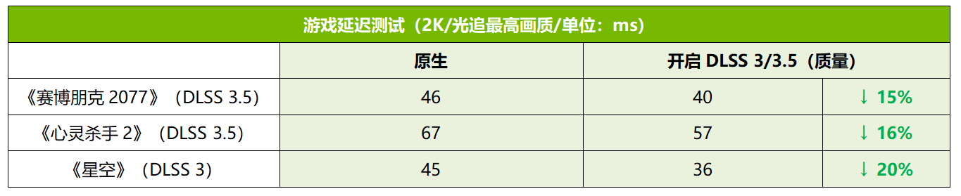 除了帧率上的暴涨之外,DLSS 3.5的光线重建也带来了更好的画面效果,可以看到,在《心灵杀手2》中开启光线重建功能之后,水面反光的细节度明显增加。另外,DLSS 3(包含Reflex)还可以降低帧延迟和操作延迟,提升玩家操控的响应速度。从测试来看,开启DLSS 3后,绝大部分游戏的延迟都大幅下降,流畅度明显增加,效果非常显著。可见DLSS 3对于游戏体验的提升是相当给力的,相当于让显卡性能免费提升了几个档次。