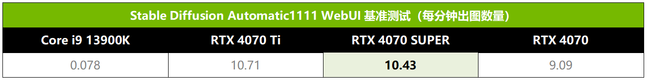 首先是Stable Diffusion的基准测试,使用了NVIDIA官方推荐的标准设置:采样方式为Euler a、采样步数为50、CFG Scale为7.5、每批次出图数为2、批次为10,最后统计每分钟出图数量。从表中可以看到,RTX 4070 SUPER每分钟出图数量达到10.43张,非常接近RTX 4070 Ti的10.71张,比RTX 4070则快了约15%。当然,要是和Core i9 13900K相比的话,RTX 4070 SUPER出图效率是它的133倍。