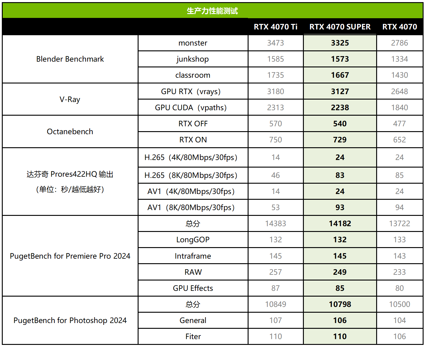 RTX 4070 SUPER不仅具备12GB显存,还有NVIDIA STUDIO加持,因此除了玩游戏给力之外也是一款高效率的生产力工具。从测试来看,在Blender、V-Ray和Octane的3D渲染输出项目中,RTX 4070 SUPER相对RTX 4070的领先幅度大约为17%~22%,相当于RTX 4070 Ti的95%~99%,比较符合基准性能的差异。在达芬奇Prores422HQ视频编码测试中,RTX 4070 SUPER与RTX 4070表现比较接近,毕竟它们拥有相同的视频编解码器版本与数量,而视频编解码器更多的RTX 4070 Ti自然表现更好。PugetBench for Premiere Pro 2024视频剪辑综合测试中,3款RTX 4070系列的总分表现比较接近,RTX 4070 SUPER领先RTX 4070 3%左右。PugetBench for Photoshop 2024综合测试,RTX 4070 SUPER同样平均领先RTX 4070大约3%。