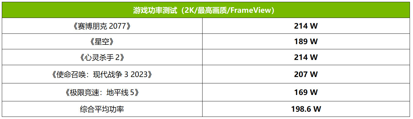 能效比是RTX 4070 SUPER的一大亮点,具体到这款华硕DUAL-RTX4070S-12G,我们用FrameView工具在游戏中记录并计算出平均功率。从结果来看,DUAL-RTX4060-O8G的游戏平均功率还不到200W,差不多等于用RTX 3060的功率实现了与RTX 3090相当的性能,能效比表现十分出色。