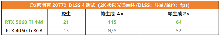 《赛博朋克2077》在开启最高光追等级后对显卡的压力很大,而RTX 5060 Ti小雕开启DLSS 4和2×帧生成后可达64fps,已经可以流畅运行,如果开启4×多帧生成,更是可达115fps,相对原生已经提升了448%之多,相对RTX 4060 Ti开启2×帧生成也提升了121%。综合来看,在DLSS 4的加持下,RTX 5060 Ti小雕可以在2K极限画质下轻松搞定光追游戏大作,相对RTX 4060 Ti的提升幅度可达数倍,确实值得主流玩家升级。