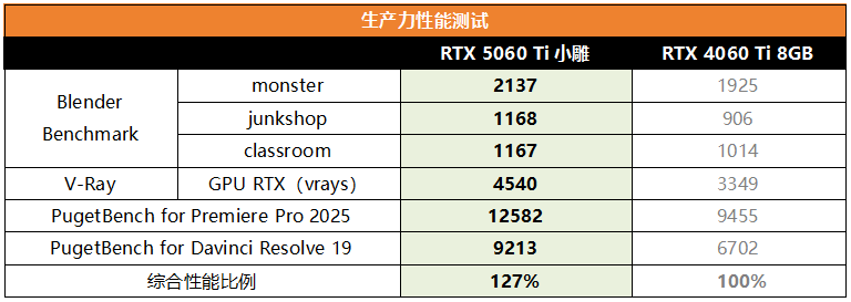 拥有16GB大显存、第九代编码器和第六代解码器的RTX 5060 Ti小雕对于设计师用户来讲也是一件高效生产力装备。从测试情况来看,RTX 5060 Ti小雕在针对3D渲染的Blender与V-Ray中领先RTX 4060 Ti的幅度大约在11%~36%,而在针对视频剪辑的Premiere Pro 2025与Davinci Resolve 19测试中领先RTX 4060 Ti的幅度高达33%~37%,可见优势确实是非常明显的。因此,对于有3D设计和视频剪辑需求的用户来讲,RTX 5060 Ti小雕也是非常值得选择的。