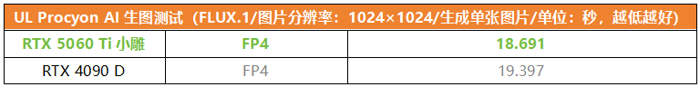 RTX 50系列增加了对FP4精度的原生支持,在支持FP4的AI应用中可以提供极高的执行效率。我们用UL Procyon AI生图对显卡的FP4性能进行测试,可以看到,原生支持FP4的RTX 5060 Ti小雕甚至比上代旗舰RTX 4090 D还快了4%。由此可见,对于有AI应用需求的主流用户来讲,同时具备16GB大显存和FP4原生支持的RTX 5060 Ti小雕也是性价比很高的选择。