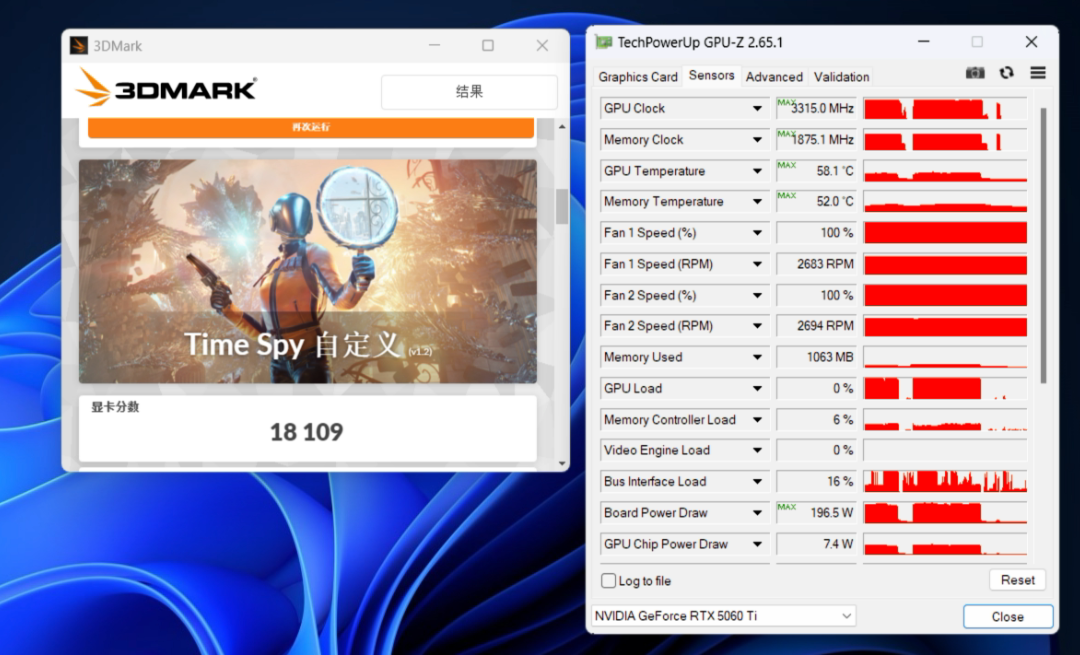 我们对RTX 5060 Ti小雕进行考机,可以看到室温26℃、默认功率和风扇转速设置下,整卡功率为180W,GPU温度最高仅为60.7℃。显存最高仅为54℃,显卡搭载的三风扇风之力散热系统确实相当给力。然后我们尝试进行超频,显卡的功率上限可以上调20%,手动把GPU频率拉到3100MHz,显存拉到30Gbps,此时在测试中的GPU极限频率高达3315MHz,TimeSpy GPU得分高达18109分,相对默认频率下的16816分大约提升了8%,甚至和RTX 4070的18163分相比差距也很小了。由此可见,得益于出色的电气性能和散热设计,RTX 5060 Ti小雕完全可以通过简单的超频获得高出一个档次的性能。