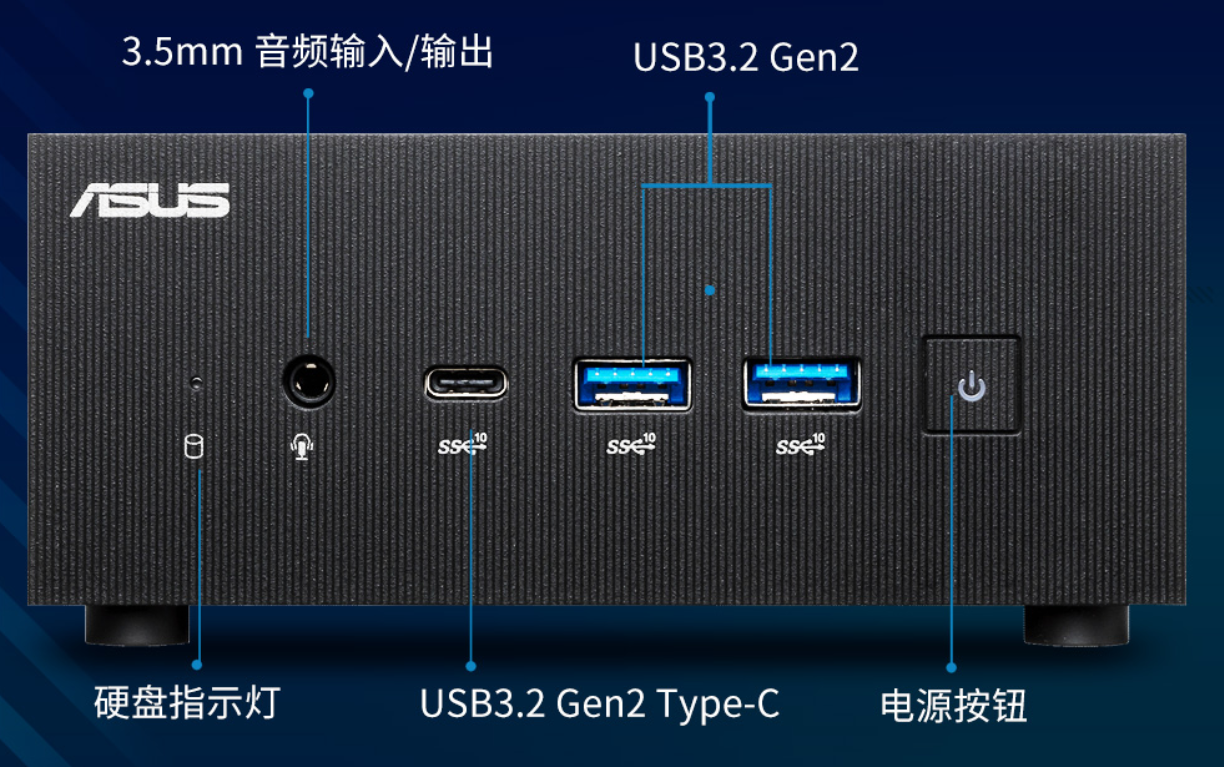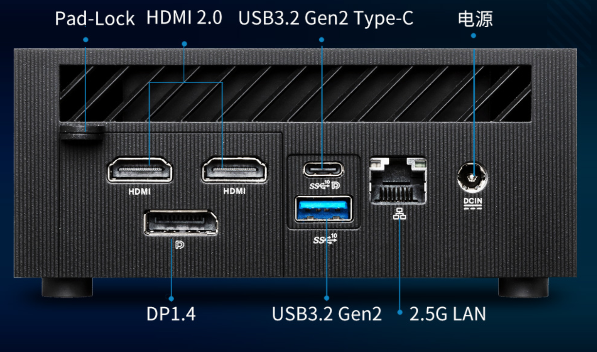 别看华硕破晓x酷睿版Mini PC身材小巧,但接口非常齐全。机身正面搭载了1个带宽为10Gbps的USB 3.2 Gen2 Type-C接口、10Gbps带宽的USB 3.2 Gen2以及1个音频输出接口。背面则拥有1个2.5Gbps网络接口、1个10Gbps带宽的USB 3.2 Gen2接口、1个10Gbps带宽且支持支持DP1.4和DP的USB 3.2 Gen2 Type-C接口以及2个HDMI 2.0和1个DP 1.4接口。如此齐全的接口,能很好地满足使用者各方面的需求。