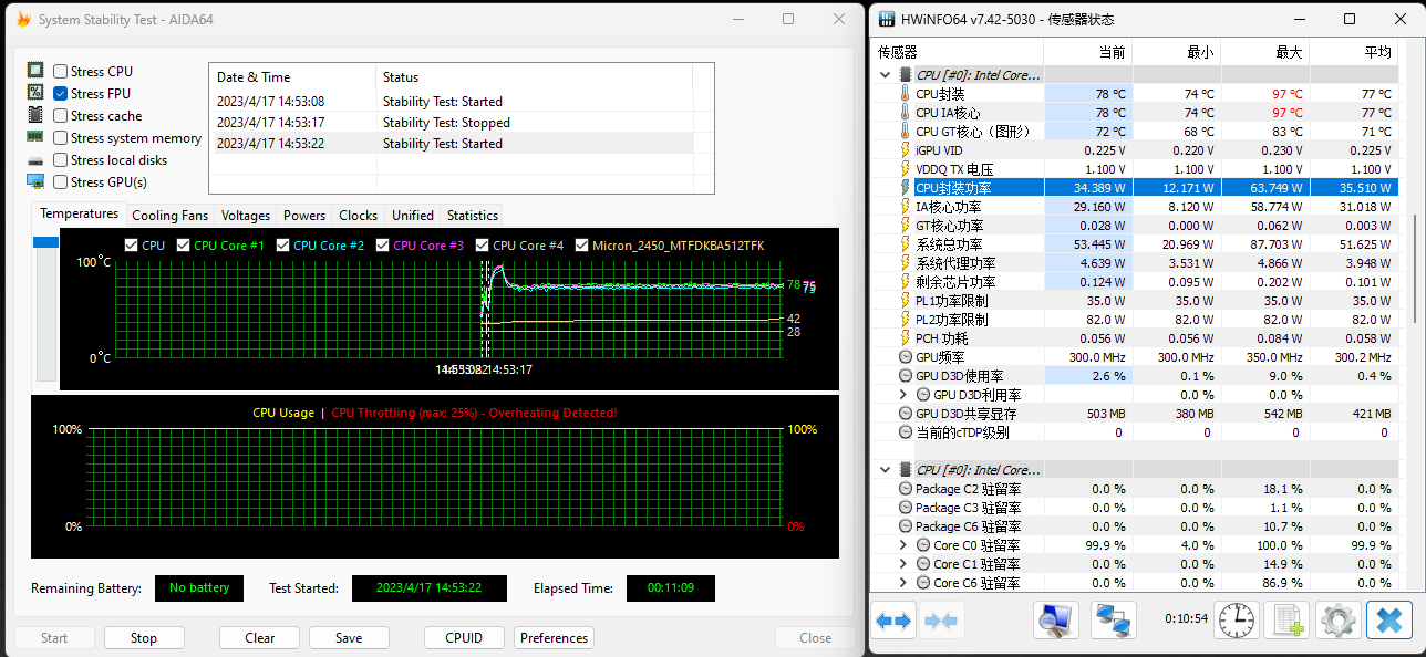 在开始性能测试前,我们通过AIDA64对处理器进行FPU考机测试,HWinfo软件显示,酷睿i7-13700H处理器的最高功耗达到了63W以上,超过了其默认的45W TDP,可见其性能释放比较充分。