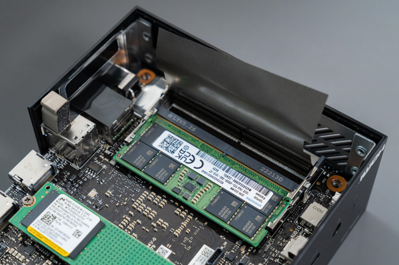 内存方面采用的则是DDR5 4800 32GB单通道内存,硬盘搭载的是PCIe 4.0 512GB NVMe SSD,系统方面则已经预装了正版的Windows 11家庭版。当然产品提供了一定的可扩展性,只要写下机身底部垫脚上的四颗螺丝,再向外抽取就能看到内部接口。