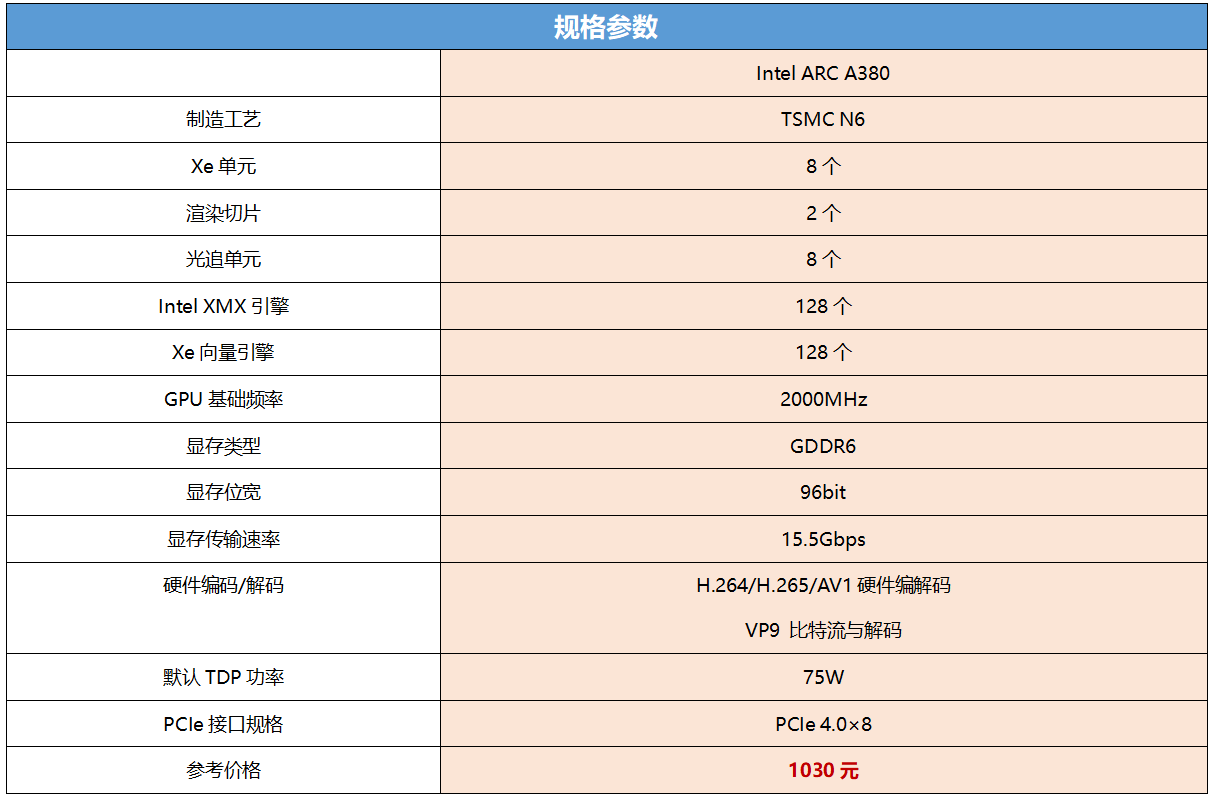 在之前的技术解析文章中我们已经介绍过,Intel这一代GPU代号为Alchemist,包含了定位高端的ACM-G10和面向主流的ACM-G11两种SOC,而锐炫A380则正是满血版ACM-G11,1030元的首发参考售价也表明了它主打千元市场的身份。锐炫A380的具体规格方面,它采用台积电N6制造工艺、具备8个Xe单元、配备6GB GDDR6显存、96bit显存位宽、15.5Gbps显存传输率,GPU基础频率2000MHz,默认TDP仅为75W,无须外接供电即可工作,不过实际上显卡厂商可能会调高频率来提升性能,所以一般也会加上外接供电接口。