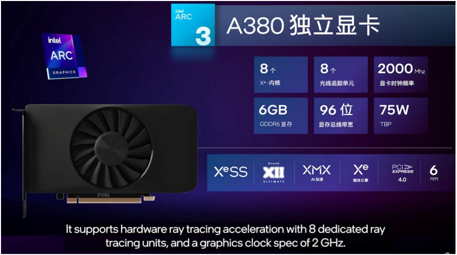 GPU技术方面,锐炫A380所使用的Xe-HPG架构设计确实很有看点,它相对于上代的Xe-LP架构来讲每瓦性能上升到了1.5倍,而最抢眼的升级则是加入了硬件光追单元,没错,就算是锐炫A380这样的千元级独显,也是带硬件光追的,这也使得锐炫A380的性价比特别突出,配合Intel独有的XeSS技术(类似N家的DLSS和A家的FSR),让主流玩家也可以比较流畅地体验光追游戏了。